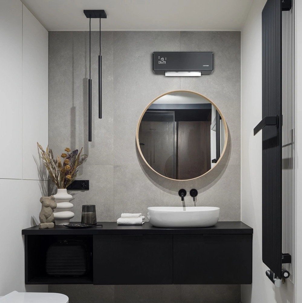 Der elektrische Wandheizkörper QH4100 besticht durch sein modernes graues Design mit Glasscheibe. Dieses Modell ist die ideale Wahl für die Beheizung von Räumen bis zu 20 m². Dank seiner IP22-Zertifizierung ist er feuchtigkeitsbeständig und somit der perfekte Helfer im Badezimmer. Die Betriebssicherheit wird durch den integrierten Überhitzungsschutz und die praktische Kindersicherung gewährleistet. Die Steuerung ist über ein LED-Display, das die aktuelle Raumtemperatur anzeigt, oder per Fernbedienung möglich. Das Gerät bietet zwei Leistungsstufen - 1000 W für Warmluft und 2000 W für Heißluft - sowie eine Ventilatorfunktion und einstellbare Flügeloszillation für eine optimale Wärmeverteilung.