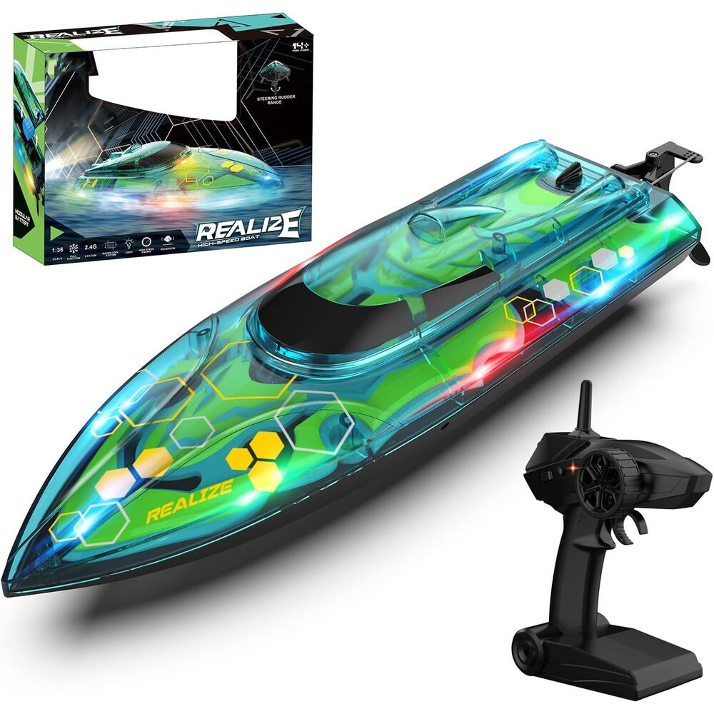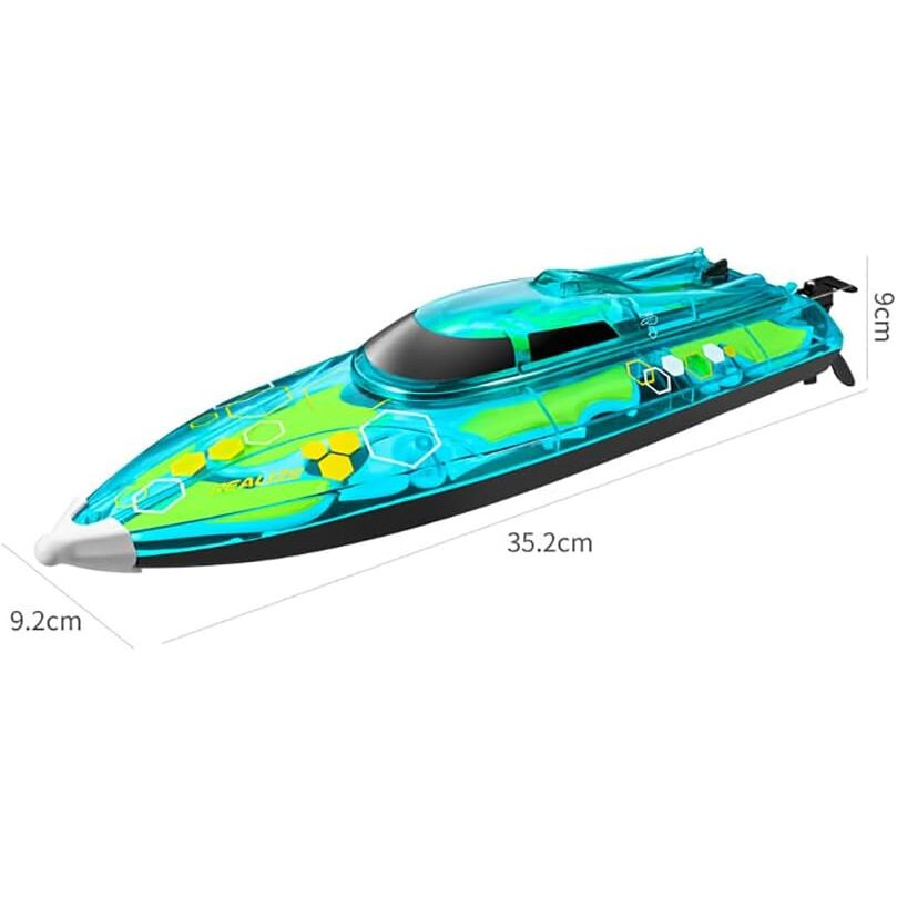 Das ferngesteuerte Rennboot Ssccgym h155 präsentiert grünes Schnellboot mit Ganzkörper-LED-Beleuchtungdie erreichen können geschwindigkeiten von 20-28 km/h auf der Oberfläche. Das Modell ist für Enthusiasten ab 14 Jahren konzipiert und bietet präzise Kontrolle durch 4CH 2.4G System mit einer Reichweite von bis zu 150 Metern. Gefäß in Abmessungen 35,2 x 9,2 x 9 cm verfügbar unter wasserdichter Rumpf aus schlagfestem ABS-Kunststoff mit einer kippsicheren Modulbauweise, die auch bei höheren Geschwindigkeiten Stabilität gewährleistet. Pistolenartige Bedienelemente ermöglichen Vorwärts-, Rückwärts-, Links- und Rechtsbewegungen einschließlich 180° präzise Drehungwobei das intelligente System automatisch sendet einen Alarm, wenn die Entfernung überschritten wird oder die Batterie schwach ist. Die Energie wird geliefert von lithium-Batterie 7.4V 600mAh ausdauernd 20 Minuten Segeln und Ladezeit 180 Minuten über das mitgelieferte USB-Kabel mit Schutz. Eingebautes Wasserkühlsystem schützt den Motor vor Überhitzung während des Rennens. Im Paket finden Sie ein Boot mit Fahrer, Ladekabel, Ersatzpropeller mit Durchmesser 2,9 cm, Ständer und Anleitung. Der Fahrer benötigt 2x AA-Batterien 1,5 Vdie nicht im Lieferumfang enthalten sind. Dieses maßstabsgetreue Modell 1:28 ist die ideale Wahl für Seen, Teiche und Schwimmbecken.