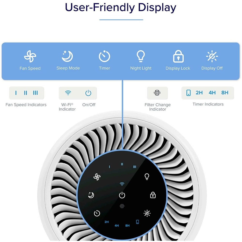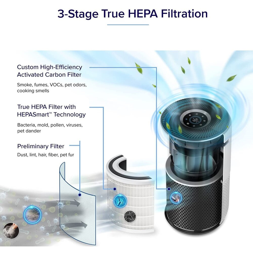 Das Reinigungssystem arbeitet in drei Stufen für maximale Effizienz. Der Außenfilter aus Nylon fängt grobe Partikel wie Haare, Staub oder Flusen auf. Der HEPA-Filter entfernt dann feine Staubpartikel, Bakterien, Schimmel, Pollen, Rauchpartikel und Hausstaubmilben. Der letzte Kohlefilter beseitigt Gerüche, Rauch und Abgase. Der Gesamtwirkungsgrad liegt bei 99,97 %, wobei Partikel mit einer Größe von 0,3 Mikrometern erfasst werden. Sie können den Status des Filters bequem über eine App auf Ihrem Smartphone oder Tablet überwachen.