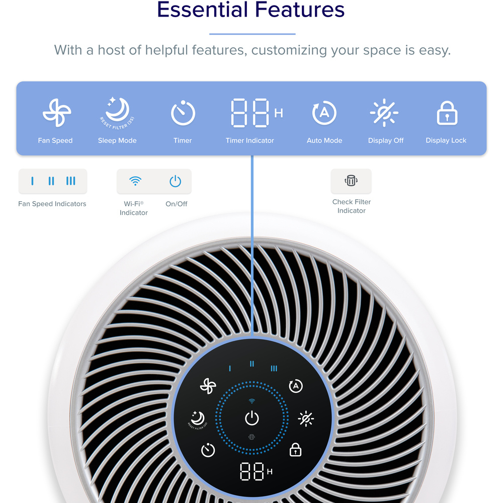 Die fortschrittliche AirSight PLUS-Technologie verwendet einen speziellen Staub-Lasersensor, der Verschmutzungen mit bis zu dreimal kleineren Partikeln erkennen kann als herkömmliche Infrarotsensoren. Das System unterscheidet zwischen vier Stufen der Luftreinheit mit Farbanzeige von blau für ausgezeichnete Qualität bis rot für Verschmutzung. Im Automatikmodus aktiviert sich das Gerät selbst und passt die Betriebsintensität an die aktuellen Luftbedingungen an, um eine schnellstmögliche Reinigung des Raums zu gewährleisten.