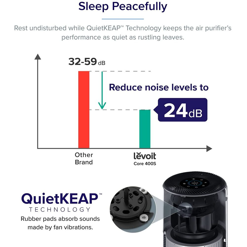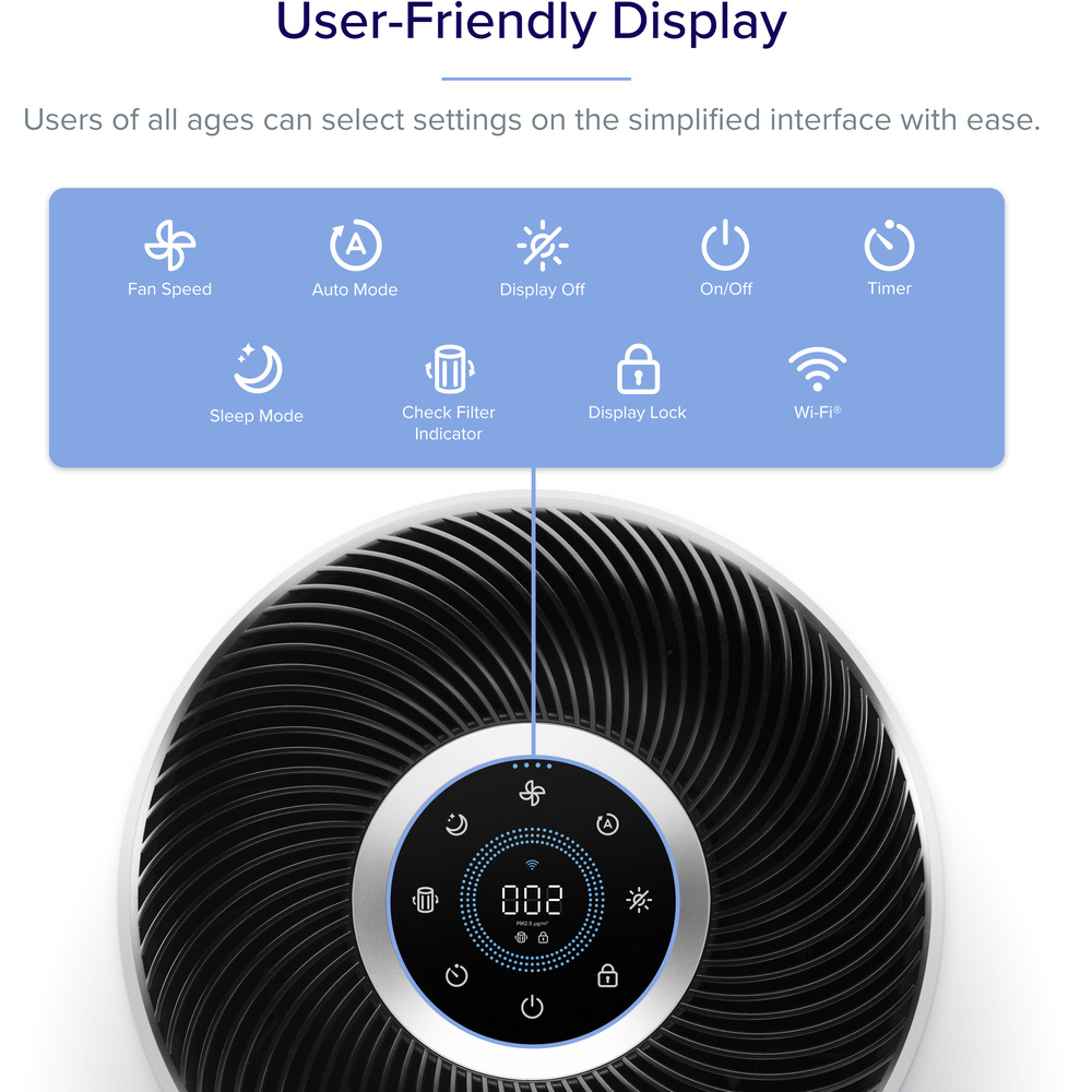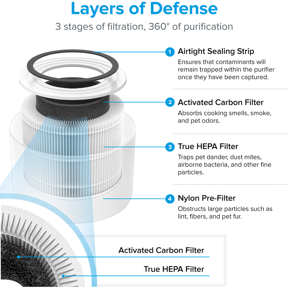 Die Luft wird in drei Schichten gereinigt, beginnend mit einem Außenfilter aus Nylon, der die gröbsten Partikel wie Staub, Fasern und Haare zurückhält. Die zweite Schicht ist ein HEPA-Filter mit ARC™-Formel, der feine Staubpartikel, Schimmel, Bakterien, Pollen, Rauchpartikel, Staubmilben und Haare herausfiltert. Der letzte Kohlefilter entfernt Rauch, Gerüche und Abgase. Das System erfasst bis zu 99,97 % aller Verunreinigungen bis zu einer Größe von 0,1 Mikrometern und ist für Allergiker und Asthmatiker zertifiziert.