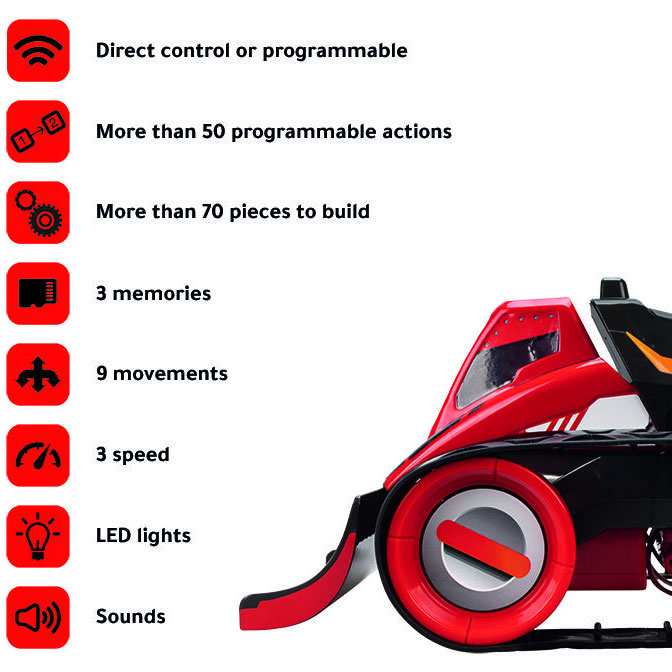 Sobald der Roboter und der Controller zusammengebaut sind, beginnt der eigentliche Spaß. Du kannst den RoboTruck in 9 Richtungen steuern, zwei Modi programmieren, das Licht einschalten oder Soundeffekte verwenden. Du kannst mehr als 50 Aktionen programmieren.