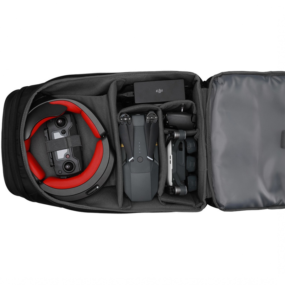 DJI Goggles, Mavic Pro (Fluggerät + 3 Batterien), Spark (Fluggerät + 3 Batterien) und zwei Fernsteuerungen (Mavic + Spark). Die äußeren Taschen bieten Platz für kleine Renndrohnen, Notebooks und andere kleine Gerätschaften.