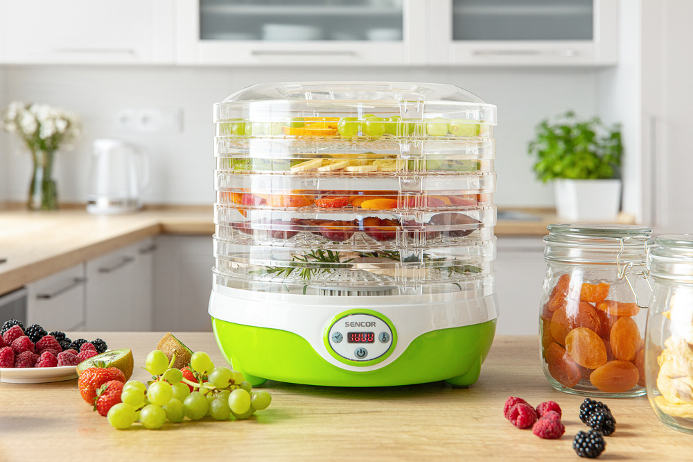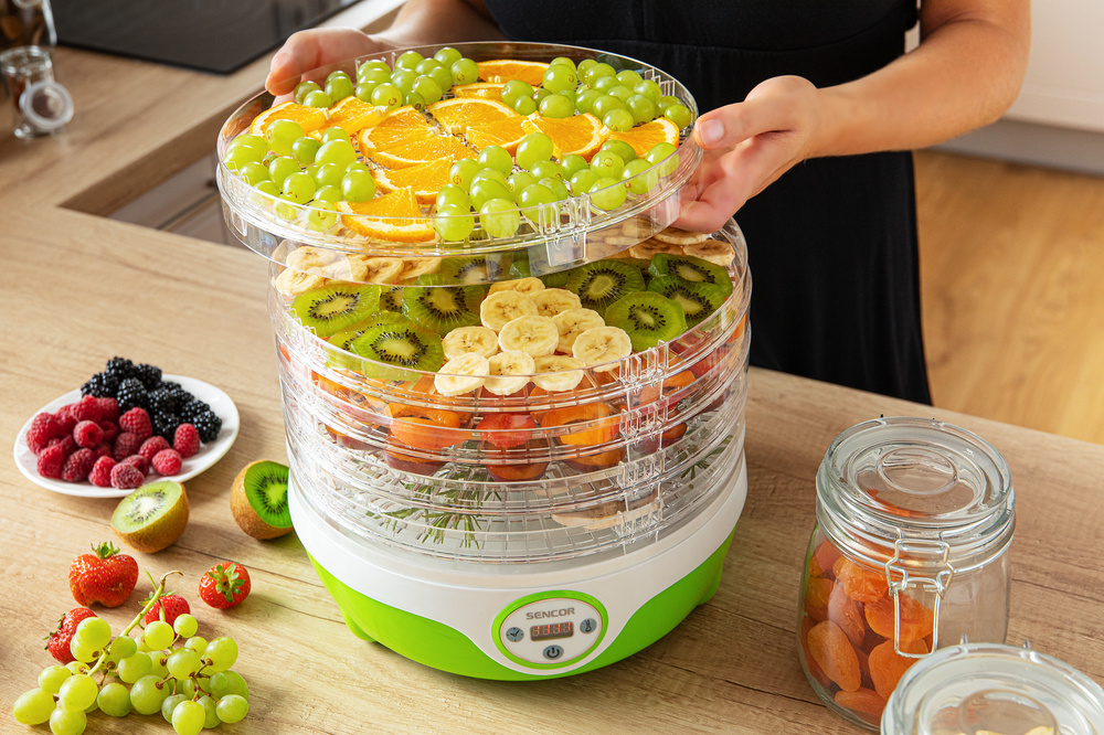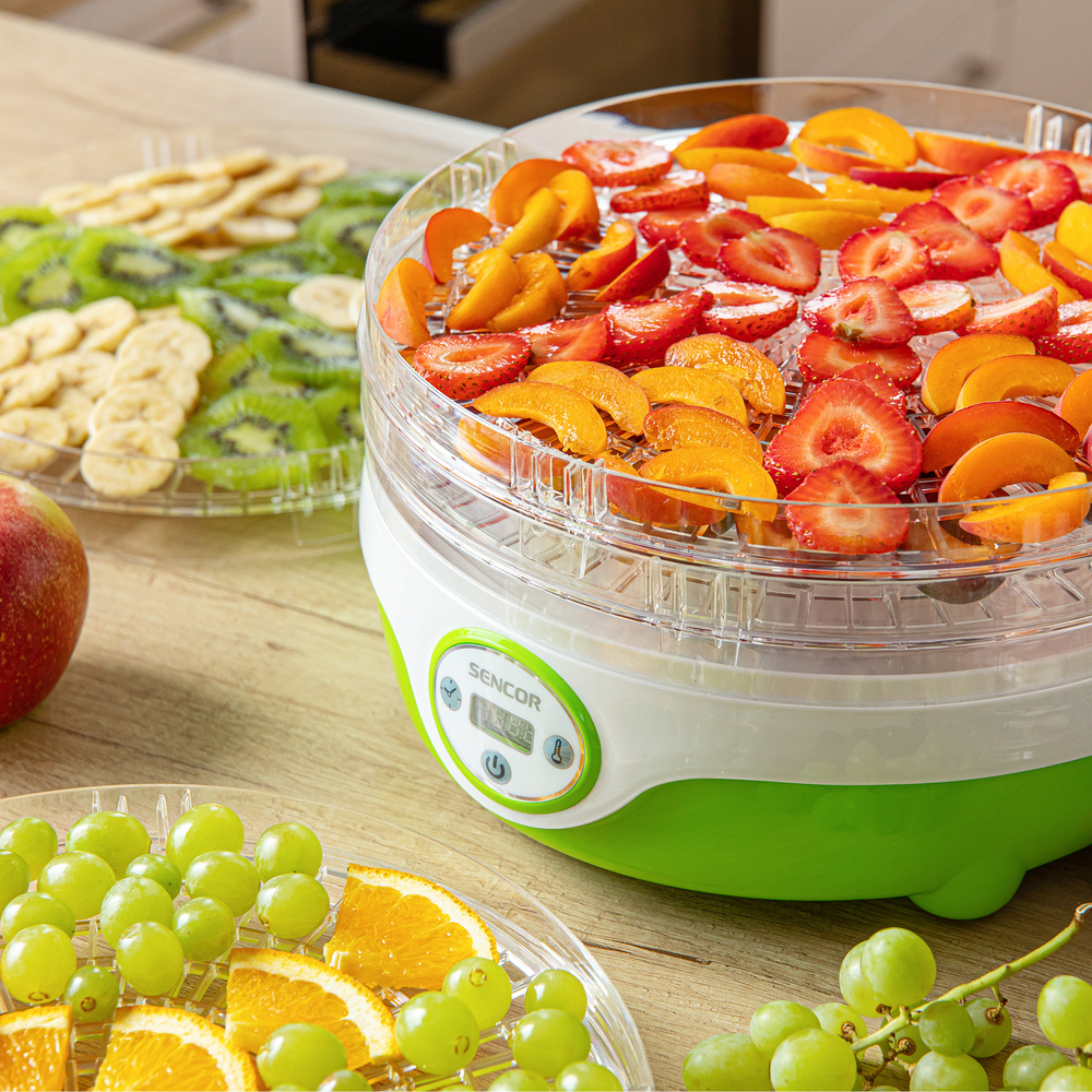 Die SENCOR SFD 851GR bietet fünf höhenverstellbare Platten mit einem Durchmesser von 25,5 cm. Die variable Plattenhöhe von 1,5-2,8 cm ermöglicht eine optimale Anpassung an unterschiedliche Zutaten. Das integrierte Gebläse sorgt für eine gleichmäßige Zirkulation der Heißluft auf allen Etagen des Trockners, während das spezielle Plattendesign den Luftstrom optimiert und Schimmelbildung verhindert.