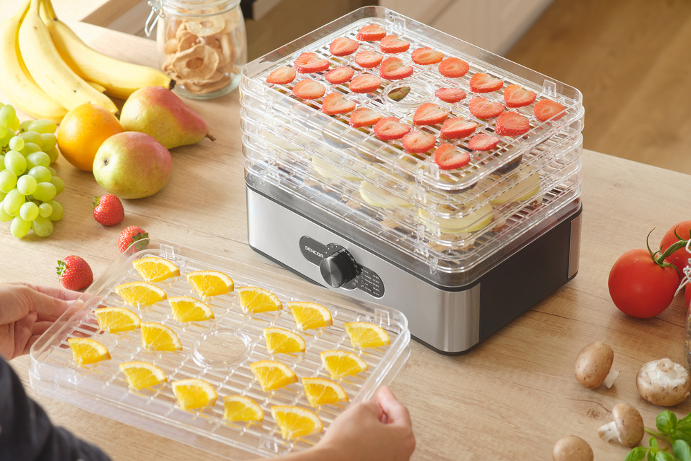 Der SENCOR SFD 950SS bietet fünf hitzebeständige Kunststoffplatten mit den Maßen 29 x 20 cm. Das einzigartige Design ermöglicht es, die Höhe der Bleche je nach Art der zu trocknenden Lebensmittel auf 16 oder 29 mm einzustellen. Das integrierte Gebläse sorgt für eine optimale Zirkulation der Heißluft auf allen Etagen des Trockners, während das spezielle Design des Trocknungsblechgitters Schimmel verhindert und den Luftstrom optimiert.
