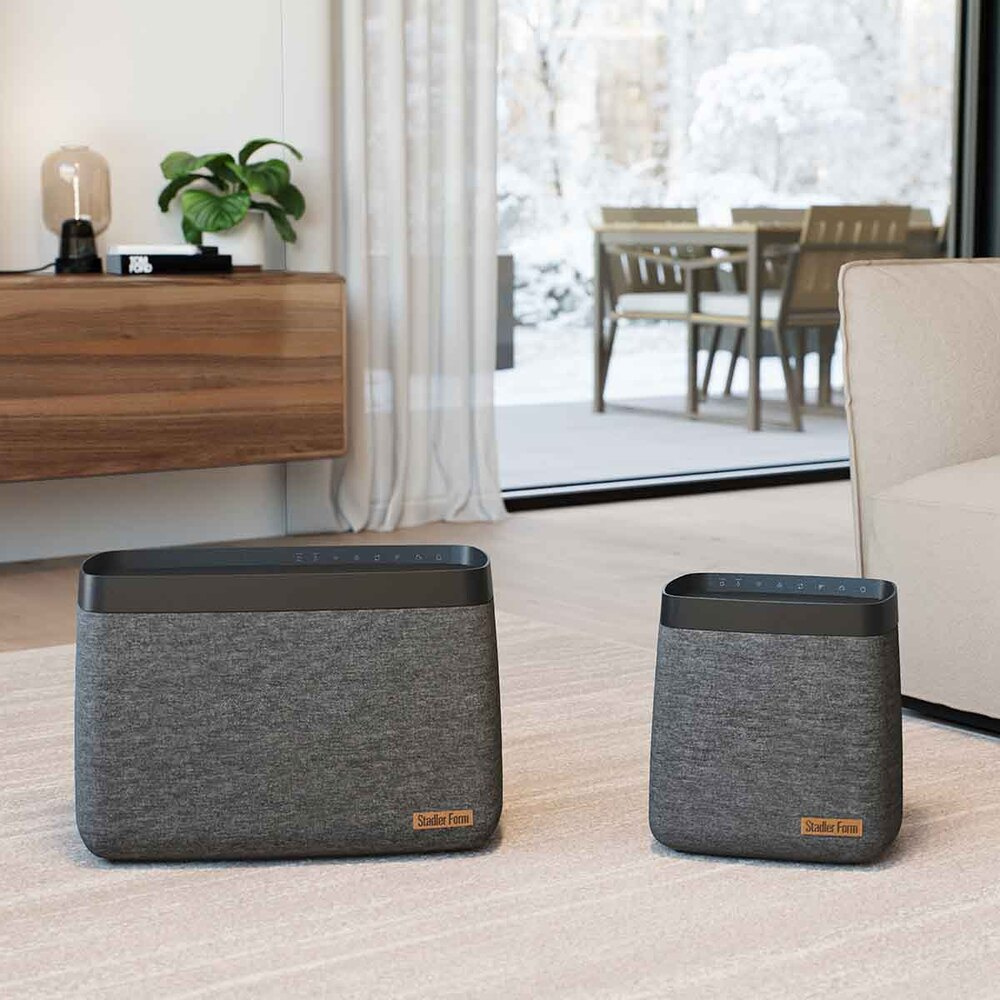 Unübersehbar, elegant, hochwertig. Das ist das Design des Luftbefeuchters Karl. Er besticht durch seine graue Textiloberfläche und das dezente Stadler Form-Logo auf dem braunen Leder. Die Bedienelemente und LED-Anzeigen sind im Inneren der Oberseite versteckt. Dadurch wird das einzigartige Design des Karl-Luftbefeuchters nicht beeinträchtigt.