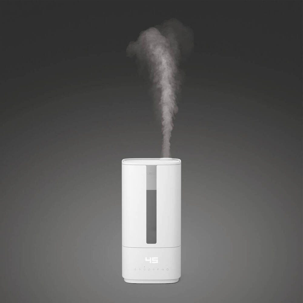 Dank seiner hohen Leistung kann der Luftbefeuchter Oliver bis zu 420 g Wasser pro Stunde entnehmen. Er eignet sich auch für größere Räume bis zu 60m2 und ermöglicht Ihnen die Wahl zwischen sechs Befeuchtungsleistungsstufen. Wenn Sie die maximale Leistung wählen, steigt der Dampf des Oliver bis zu einem Meter hoch.