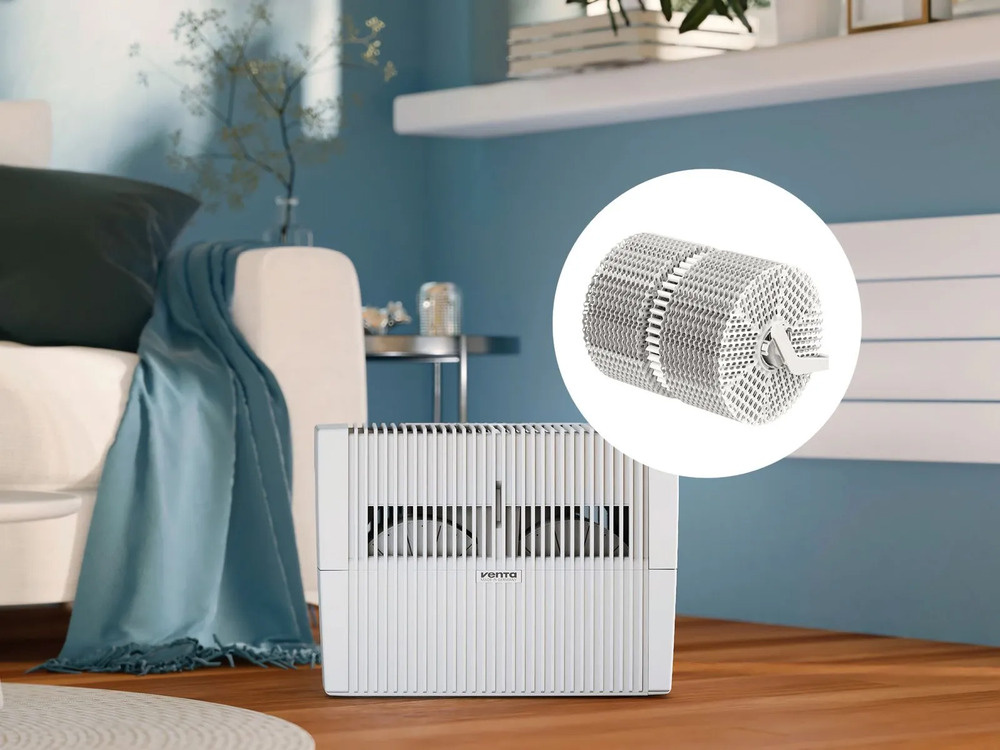 Reines Wasser verdunstet durch die in der Wasserwanne rotierenden Platten und befeuchtet die Raumluft. Diese Kaltverdunstungsmethode ist die beste und hygienischste Methode der Luftbefeuchtung und auch die natürlichste Art, Schadstoffe in der Raumluft zu reduzieren.