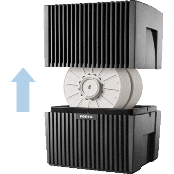 Reines Wasser verdunstet durch die in der Wasserwanne rotierenden Platten und befeuchtet die Raumluft. Diese Kaltverdunstungsmethode ist die beste und hygienischste Methode der Luftbefeuchtung und auch die natürlichste Art, Schadstoffe in der Raumluft zu reduzieren.