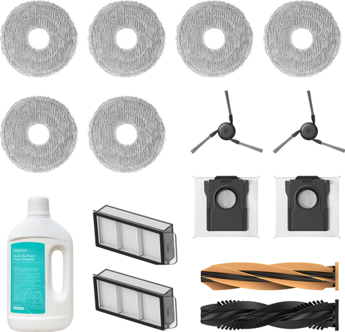 Dieses zusätzliche Set enthält 6x Wischtuch, 2x Seitenbürste, 2x Filter, 2x Staubbeutel, 2x Hauptbürste und Reinigungslösung.